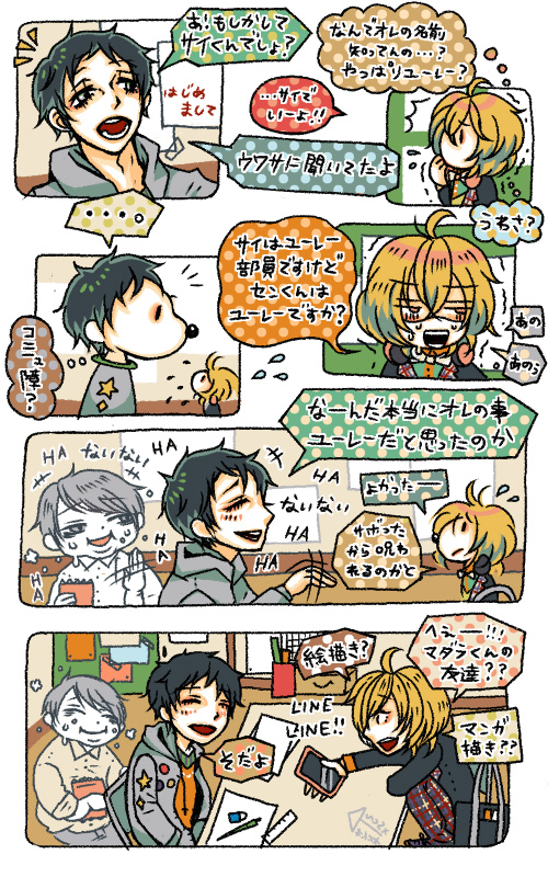 みんな、だれかのだいじ。 Category:[男子化] Date:2016年01月28日 投稿者: sai カテゴリ: イラ部 投稿日: 2016年1月28日最近、スヌアイテムが目白押しで嬉しい。I LOVE スヌーピーもかわいかったね。行き当たりばったりで中途半端に大きいサイズで描いたらもさもさになっちゃった。じんわり縮小したのもいかんかったね。水色ストライプを使うのそろそろやめたいのに好き過ぎてどうしても使ってしまう。フォルダのサムネが同じ色過ぎて笑えない。投稿者: ぱらら 投稿日: 2016/1/30 投稿番号:1ピーナッツ風キャラ可愛すぎや!!!スヌーピー好きにはたまらん。和む〜。(映画は見てないけど。。。ヾ(ーー )ォィ ハイ☆スピードは3回も見たのに。。。)好きな色やアイテムは無意識にでもよく使うよ〜(^。^)投稿者:sai 投稿日:2016/2/3 投稿番号:7 スヌーピー可愛いですよね(*´o`*)。私は平面をこよなく愛す人間ですがI LOVEは2Dと3Dともふもふ感がMIXされてて絶妙な雰囲気がありました。平面で短編が1番好きですが何も言うまい。そして自分で描いておいてアレですがピーナッツ風にしても違和感のないイラ部員に非常に満足です。笑。絵の背景と絵板の背景が同化して頭を抱えておりましたがぱららさんの温いフォローにより元気を取り戻しました(*=v=*)←単純。ぱららさんは色彩もアイテムも自由自在って印象が強いですよ!。ハイ☆スピード3回って言うのも凄いな(0゚・∀・)✧。流石ぱららさん流石!。投稿者: sai 投稿日: 2016/1/30 投稿番号:2〜5 幽霊(じゃなかった)部員センとサイ未知との遭遇。センくんを見てすぐ落書いたのに下描きだけで止まっててUP時期を逃したやつ。メンバーが増えてて嬉しいサプライズだった件を表現したかったのでした。内容は薄い上にチグハグだけど部室とかスヌ化とかふとましさんとか描けて満足です。ラクガキピーナッツ風がなんか可愛く描けた気がするのでまた新記事にしてしまった。時期を逃してどうにもならなくなってしまったラクガキが色々あるけどイラ部(男子化)は設定が少ないので遅くなってもなんとかなったりするのが良いですね。・イラ部員のLINEはワンニャさんスタンプ率が超高そう。(ワンニャさん可愛過ぎて辛い。いや辛くない尊い。)・センくんビスコ好きそう(イメージ)。・センくん「ヤホーで調べました」って言いそう(イメージ)。・マダラくん都こんぶ好きそう(イメージ)。・ピヨくんコーヒー好きそう(スタバかコンビニ)。・マダラさんはドトール派のイメージですが部室で普通にドリップしだしそう(イメージ)。・サイくんはコーヒー飲めません。投稿者: むらき 投稿日: 2016/2/1 投稿番号:6なぜヤホーネタやドトールに通うことを知っているのだ!?ドトールのお兄さんが顔を覚えてくれたことが嬉しかったりするとか…都こんぶおいしいですけどあれ食べ過ぎると苦しいですよね(´・ω・`)ワンニャさんスタンプで会話してそうですねwイラ部ライン画面作りたいぐらいですイラブは設定少なめでのんびり回れるので私も助かります~!しかしすぬーぴーかわいすぎて、にやにやしちゃいます。センはね、イラ部ぼっちでしたときに自分で錬成したのですよ(^_^;)投稿者:sai 投稿日:2016/2/3 投稿番号:8 ドトールはともかく、まさかのヤホーがいい線いってたとは驚くしかない!。笑。コーヒー飲みたくなったら何処のカフェでもサラッと入れる大人なマダラさんっていうのもいいな。都こんぶは腹に全然溜まらないなー…と思いながらムグムグ食べてるといきなり甘味料の打撃を受ける食べ物ですよ。そしてワンニャさんスタンプ連打するイラ部員は絶対カワイイ_:(´ཀ`」∠):_。ライン画面もいいなぁ!夢が広がりまくる!。イラ部ぼっちにさせて申し訳ないわと思いつつもセンくんナイス錬成に拍手喝采でした!d(゚∀゚)b。やっぱり活動人数は4人ぐらい居ると安定しますね!。スヌにもコメント有難う御座います₍₍ (ง ˙ω˙)ว ⁾⁾ま・ま・まんぞく! PR