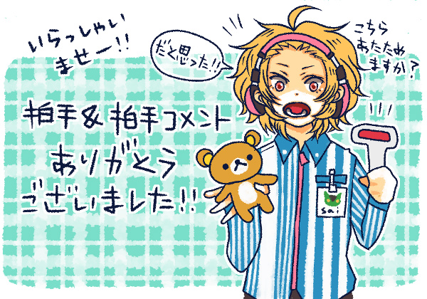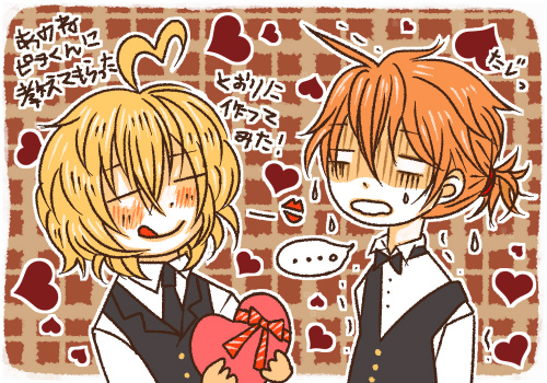 cafe de chocolat. Category:[男子化] Date:2015年02月11日 いらっしゃいませ。本日のおすすめはザッハトルテとフォンダンショコラです。ごゆっくりおくつろぎください。ギャルソンを描きたかったのです。1ヶ月ほど前に描いたラクガキですが季節に合わせてチョコレート色で仕上げてみました。流石にちょっとくどくどしかったか…!男子化saiとピヨくん。アホ毛仲間です。ピヨくん描くのが楽しくて仕方がなかったんですがいまいち似てない気もする。もうちょっと髪に立ち上がりとボリュームを出したかったのですが難しい。もしかしたら目力も足りないのかも…!?。投稿者: sai カテゴリ: イラ部 投稿日: 2015年2月11日いらっしゃいませ。本日のおすすめはザッハトルテとフォンダンショコラです。ごゆっくりおくつろぎください。ギャルソンを描きたかったのです。1ヶ月ほど前に描いたラクガキですが季節に合わせてチョコレート色で仕上げてみました。流石にちょっとくどくどしかったか…!( ≡ε≡ )。男子化saiとピヨくん。アホ毛仲間です。ピヨくん描くのが楽しくて仕方がなかったんですがいまいち似てない気もする。もうちょっと髪に立ち上がりとボリュームを出したかったのですが難しい。もしかしたら目力も足りないのかも…!?。しかし、さらふわヘアーってどうやって描くんだろうね( ・◇・)?。毛束とか綺麗に描けるようになりたい!。投稿者: ぱらら 投稿日: 2015/2/16 投稿番号:1何度見てもソワソワドキドキ浮き足立って舞い上がってます。ピヨコからsaiくんに友チョコを、、、と思ったのですが男から男へあげるのは『H○M○チョコ』って云うんだと判ったらアンテナが変な方向に反応してしまい渡しそびれました。ボウヤダカラネ。。。( ̄◇ ̄;)エッ・・・コメ欄に何書いてんんだ。。。スミマセン。甘くとろけそうな思いに浸らせて頂きありがとうございました。幸せじゃ゚.+:。(´∀`)゚.+:。投稿者: sai 投稿日: 2015/2/16 投稿番号:2 わー!ぱららさん!充分な拍手コメを頂きましたのにコメントまで下さって有り難う御座います。ピヨくんの隣にもしゃもしゃな金髪が満面の笑みで陣取ってて申し訳ありません。笑。ピヨくんをお借しくださって……ん?違うな?勝手にお借りしてすみませんでした!。そして…えっ!ピヨくんから友チョコ!?そんな贅沢が私に許され……る…と思ったら大間違いだったぜ!。敗北il||li_| ̄|○il||li。笑。うふふ、ソワソワ₍₍ ◝('ω'◝) ⁾⁾ ₍₍ (◟'ω')◟ ⁾⁾ドキドキしちゃった。だがしかし気持ちだけはガッツリ受け取った───!。そしてH○M○チョコって言うの全然知らんかった"φ(・ェ・o)メモメモ。誰だよそんな事を言い出した奴は!。……天才か!。アラアラウフフ*ピヨクン*ボウヤナノネ…(≖‿ ≖)コッチオイデ。シシュンキ*カワイイヨ。ピヨくんのアンテナはぱららさん譲りのハイスペックアンテナに違いないので大変そうですね(ꈍ-ꈍ)。saiくんは空気読めない&読まないので公衆の面前でチョコ渡すよ!。謎の強メンタルだからピヨくん超気をつけて!。笑。むしろ逃げて!。校門で待ち伏せされないように!。こちらこそ楽しいひとときを頂きまして誠に有り難う御座いましたー。今後もピヨくんを勝手にお借りすると思いますが気にせず見守っていて下さい(๑•̀ㅂ•́)و✧。あの…スルーして頂いて構わないので!。笑。※絵コメはぱららさん家のショコラティ絵に添えようかと思って描いたもの。流石に、しょぼ絵過ぎてお蔵入りになりました。笑。ぱららさんのバレンタインピヨくん…とても…素晴らしかったです…!(//´/◒/`//)。投稿者: sai 投稿日: 2015/2/17 投稿番号:3 拍手&拍手コメント有り難く賜りましたー!。わーいわーい嬉しい悲鳴が出ました(//´/◒/`//)。saiくんはオシャレなカフェよりコンビニバイトが似合う男です。そして髪の毛を上げると外ハネになります。ヘッドフォンが使えない場合は諦めてカチューシャ野郎になります。もふもふ蜂蜜髪は基本的にバイトの面接ガンガン落ちます。 PR