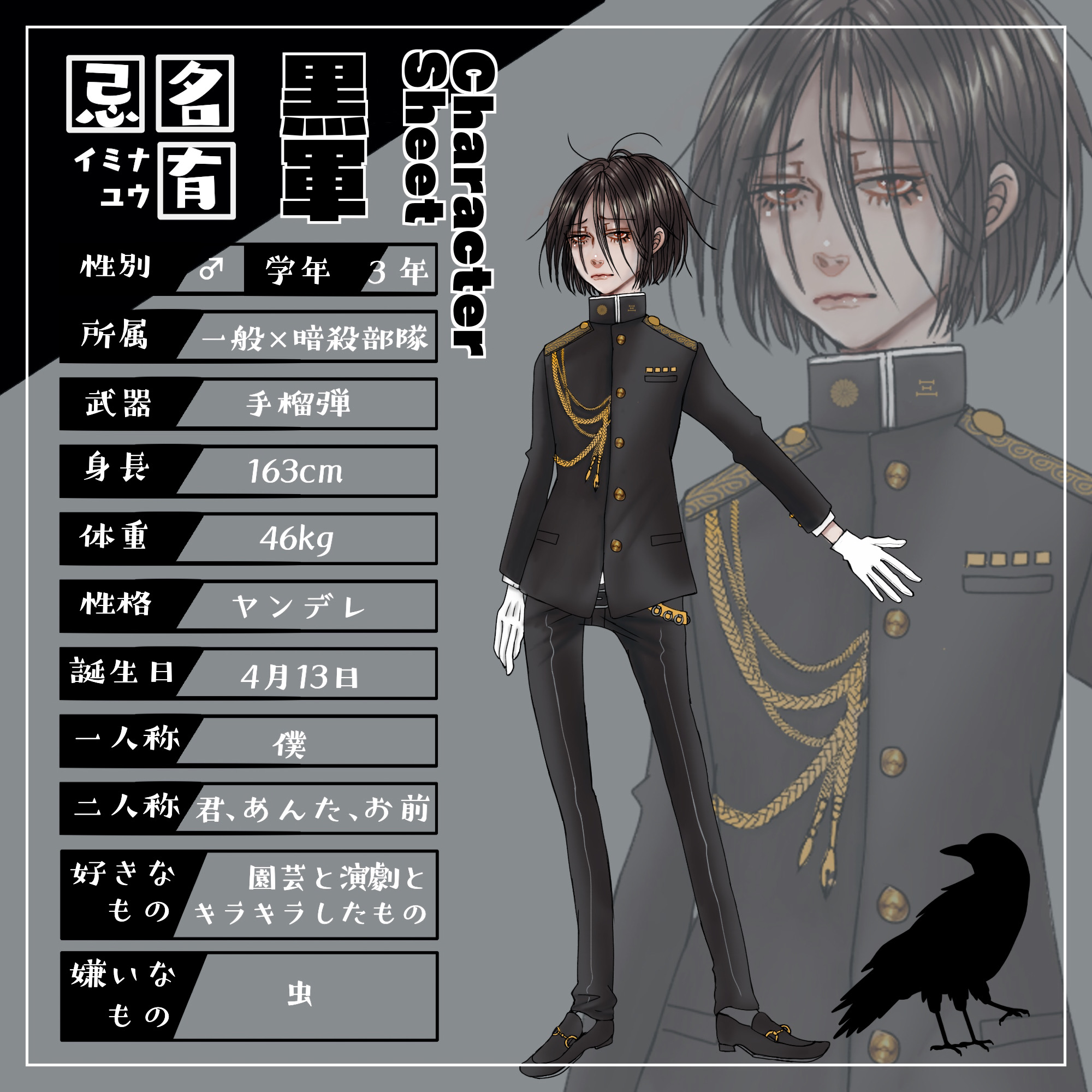 『黒軍に所属する3年生。奇襲が得意。艶やかな黒髪に赤眼。ヤンデレちっくな性格で使用武器は手榴弾。動物好き。』忌名 有/イミナ ユウ花ばなに付いた虫を殲滅するのが日...