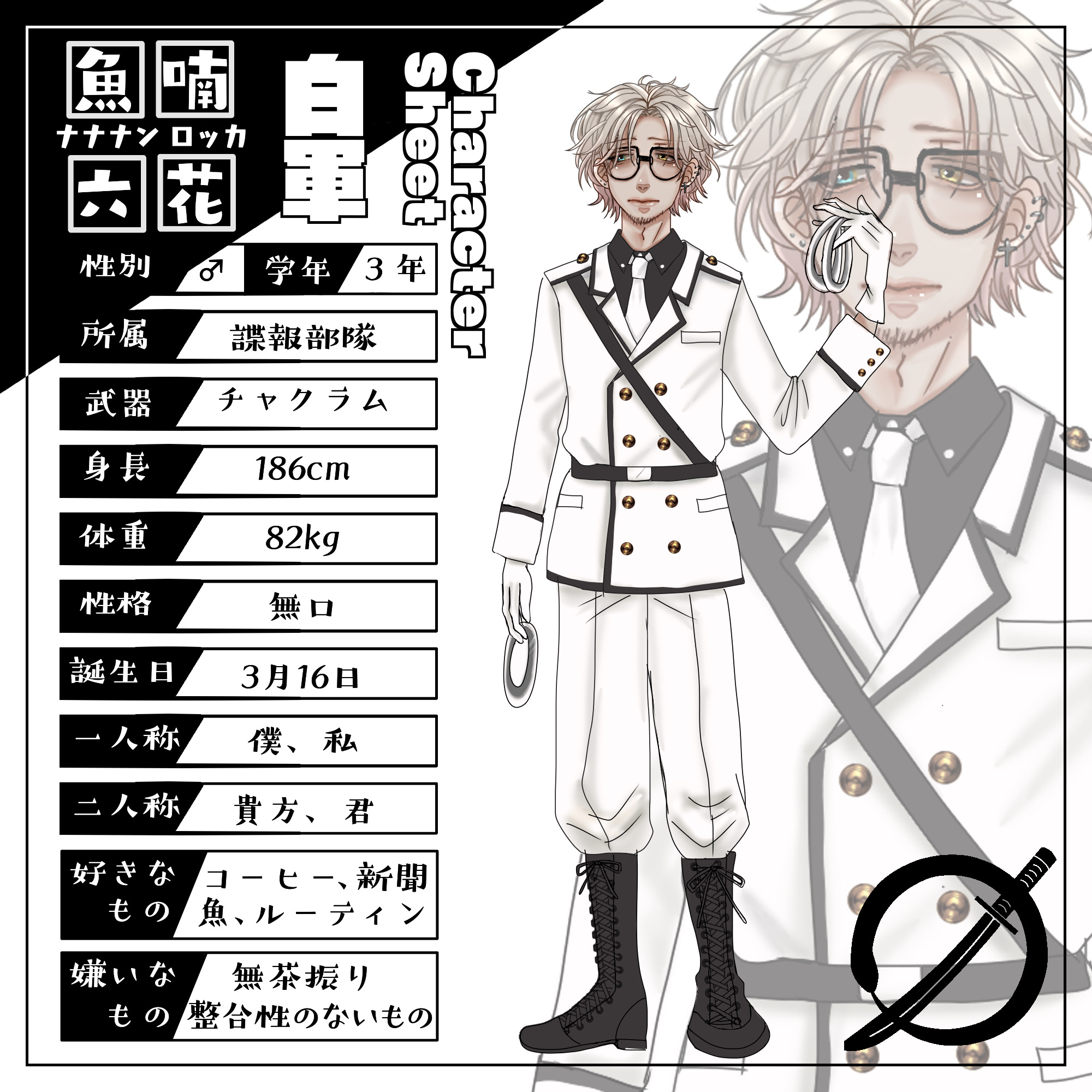 『白軍に所属する3年生。諜報活動が得意。色素の薄い髪に金と青のオッドアイ。無口な性格で使用武器はチャクラム。ピアスを大量に付けている。』