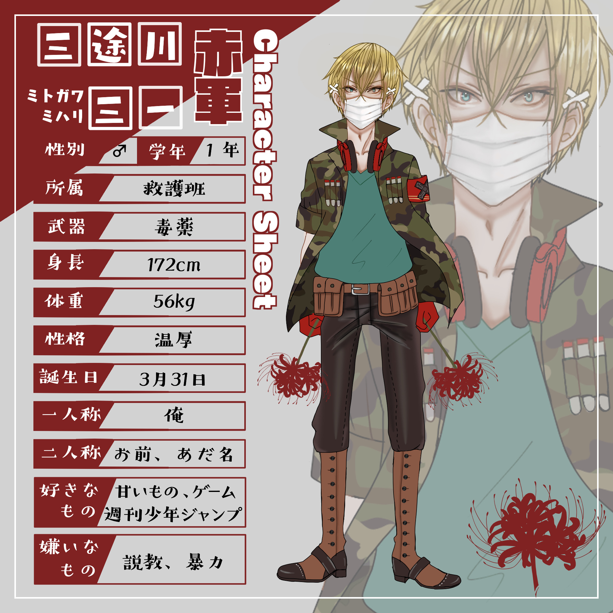 『赤軍に所属する1年生。救護班の一員。美しい金髪に碧眼。温厚な性格で使用武器は毒薬。使用法は様々。いつも首にヘッドフォンをかけている。』