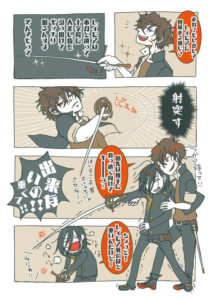 ぱららさんちの子と学戦交流 Category:[PIC] Date:2020年05月20日 投稿者: sai カテゴリ: 創作 投稿日: 2020年5月20日▼学生戦争ったー厚塗り出来ないなら線画を!ちゃんと!描かねば!と思って慣れない細線画チャレンジしてみてました。細い線で描いてみたら私のモッサリした古臭い絵も少しは今っぽくなるかな!?と!!!!▼呼び方┗六花→卯月くん┗忌名→弥生たまにやよい▼ぱららさんちの学戦っ子キャラシhttps://www.illustbook.net/wing/20161210431.html▼うちの学戦っ子メモ(キャラシ行方不明中)https://www.illustbook.net/3156/2014125251.html投稿者: sai 投稿日: 2020/5/20 投稿番号:2 ▼黒軍ver.ぱららさんの黒軍’sとの共通点は弥生くんが横顔な所。\弥生くんの横顔を眺めたい説/うちのイラストだと弥生くんが前だけどぱららさんのイラストだと忌名が前なのが面白い。ぱららさんの黒軍イラストはレイピアの構えがしっかりしてて流石でしたー!拝見した後、自分の絵に頭を抱えましたもん。笑。弥生くんは襟もヒョウ柄なんですね。確かに弥生くんプラスチックカラー嫌いかも知れん!投稿者:ぱらら 投稿日:2020/5/21 投稿番号:5自分、コメントなんかしてしまったらこのスレ汚してしまうんじゃないかと思う。自分の1日の始まりは寝床の中でスマホから新着の皆さんの描かれたイラを見て眼福に浸りながら心地よく起きたいと思ってる。が、今朝は新着見るなり動悸が激しくなって気絶した(きっと2度寝じゃない)。パソコンの大きい画面で見た〜い!と思ってるときに限ってすぐ見られない(~_~;)。描いてもらえるの夢だったのでPCで見るまで夢かもと思った。でも夢じゃなかった!夢だけど、夢じゃなーい!思わずドングリの木の周りで踊りそうになった。なんて耽美なイラストなんだ。後光がさしてる。ため息しか出ん。ありがとう。ありがとうございます。そして見事にシンクロしてたのが何より嬉しい。ダガーナイフもしっかり使ってるの(自分描き忘れるので)ありがたい。お見事。下手したら忌名くんの首切りそうでヒヤヒヤする。そいや、レイピア持って戦ってるシーンを描いたことはなかったと思う(笑)。取り敢えず、持たせてる。。。もしかしたら装飾品かもしれない。。。実は襟の裏地もカラーもヒョウ柄と云う説。。。(^◇^;)。投稿者:sai 投稿日:2020/5/23 投稿番号:9 ぱららさんがいらっしゃらないと恐怖の壁打ち地獄になるじゃないですか!そんな事あってたまるか!笑\\\おいで///弥生くんお貸し頂き有り難う御座いますー!喜んで頂けて嬉しいです。やったー!ぱららさんにめっちゃ美麗に素敵に描いて頂いたので私も出来る限り頑張りました。\夢だけど/\夢じゃなかった/しかし自分が細部まで見えてない状態なのでPCでどう見えるか自信なくて震える。持ってるダガーも中世的な短剣にしたかったのですが弥生くんの髪の毛にリソース割き過ぎて力尽きました。笑。剣先はまさに忌名の顎をかち上げて頂きたかったんですが私が角度のついた絵が描けず挫折しました。ぐぬぬ。今回の忌名も俯瞰になるはずだったんですがこの体たらくです。私もバトルシーンとか描けるようになりたい。おかげで忌名もヤンデレを披露する場がなくて無駄ツンデレになってる。なん…だと…!?弥生くん裏地だけじゃなくカラーもヒョウだと……!?新事実にビックリしたのでメモメモ。弥生くんヤンチャだな!ノープランですが白軍ものんびり描いてくので待たないで下さいねー!笑投稿者: sai 投稿日: 2020/5/20 投稿番号:2 デフォルメでもレイピアを描けなくて描けな過ぎて弥生くんを描こうとするたびこんな気持ちになります。でもカッコイイから持たせたいんですよね!めっちゃ練習するわ!めっちゃ練習になるわ……!忌名すぐわがまま言うので弥生くんご迷惑お掛けします……。投稿者:ぱらら 投稿日:2020/5/21 投稿番号:6レイピア、自分もよくわからん。泣。でも、カッコイイから持たせたい。うん。正解がわからん。グーグルさんで『レイピアの持ち方』って調べたら以前、描いたヘッポコな自分の絵が出てきてビックリすると同時になんでコレ?と萎えた。『レイピアの持ち方が解らない』とコメントしてただけなのに。。。泣。忌名くんのわがままじゃなくて、くもり無きまなこの素直な疑問。カワイイ。全然、迷惑だなんて思ってない。むしろもっと言ってやって。まとめて一つにコメまとめられずズミマセヌ。投稿者:sai 投稿日:2020/5/23 投稿番号:10 良かった!レイピアはそんなんじゃない!とか言われたら無かった事にするしか出来ないのでおかげで好き放題描く練習が出来ます。笑。イラブの唯一嫌いな所ってそこなんですよ!\画像検索にめちゃくちゃ引っかかりやすい所ー!/好きなキャラ描くとき画像検索すると自分の絵が邪魔してくるので出来るだけひっかからないようにしたくて今スレ画下げとかテキスト画像化とか試してみてます。笑。ちょっと前まではmetaタグ効いてたんですがいつからか無効化してしまった。くもり無きまなこと言うと弥生くんのサブウェポンはエボシ様の